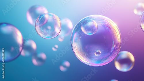 Iridescent soap bubbles floating on a vibrant blue and purple gradient background.