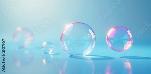 Iridescent soap bubbles suspended on a calm light blue surface, iridescent, soap bubbles, translucent