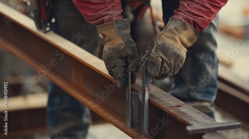 Ironworker attaching steel supports to a building frame. Featuring strength and precision