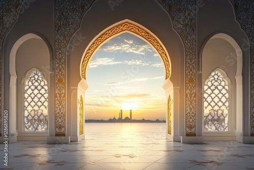 islamic architecture ornate arched doorway and intricate geometric patterns with golden light under a serene sunset sky