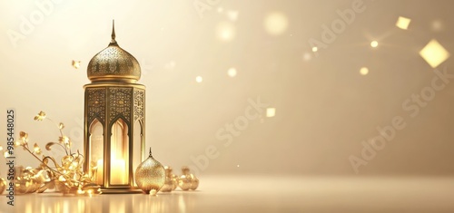 Islamic background design for Ramadan with a mosque and lantern for a banner, frame or template on a white empty space background.
