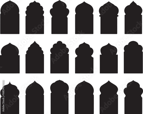 Islamic Dome & Arch Silhouettes, Vector Set, Mosque, Arabian, Architecture, Window, Door, Pattern, Isolated, Black, Simple
