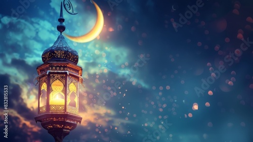 Islamic greetings ramadan kareem card design template. Space for text. background with beautiful lantern and crescent.