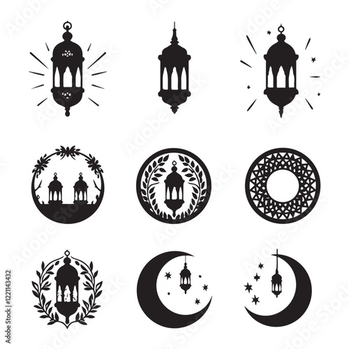 Islamic lantern light vector silhouette, Ramadan Islamic lanterns vector illustration Lantern Icon, Black and White, Traditional Lighting Design Islamic lantern element set for ramadan in silhouettes.
