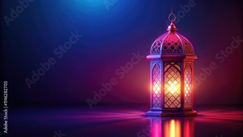 Islamic Lantern Neon Light Glowing on Dark Red Background with Ramadan Kareem and Eid Mubarak Greetings Background