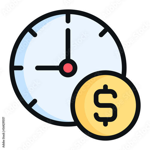 Isolated clock with dollar coin in outline color icon on white background. Time is money, working time, office hours, timer, business and finance