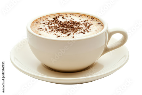Isolated Cup of Cappuccino Coffee with Cocoa Sprinkle on a White Plate