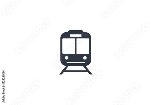 Isolated dark blue train icon with white background showing front of the train and train tracks