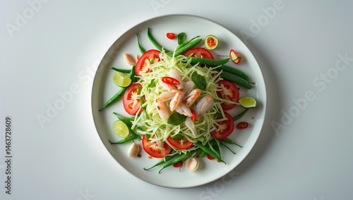 Isolated flat lay (top view) of Papaya Salad with salted crab, tomato, lime, chili, garlic, and snake bean on white background, clipping path included