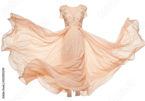 Isolated Flowing Peach Chiffon Gown with Floral Appliques