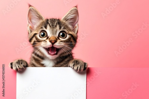 Isolated kitty cub on a solid attire pink background. Animal looking cute. Blank board studio pic. Cat promo idea. Сute cat serengeti hold in front paws a layout - large white way sign.