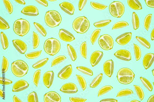Isolated lime pattern or wallpaper on turquoise green background. Summer concept of fresh ripe lime liths and slices shot from above