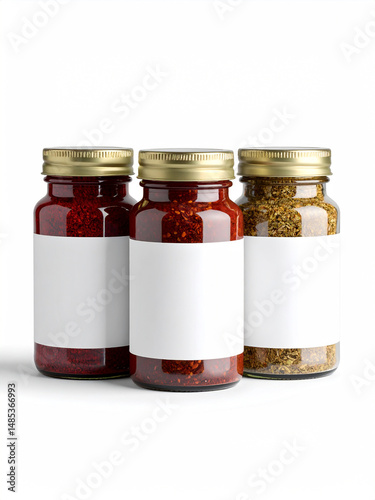 Isolated Mockup of Spice Jar Set with Blank Labels Featuring Cumin, Za’atar, and Sumac