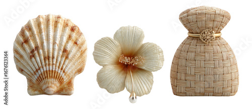 Isolated objects featuring shell, flower, and woven bag on transparent background