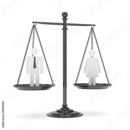 Isolated old fashioned pan scale with man and woman on white background. Gender inequality. Equality of sexes. Law issues. Silver model. 3D rendering.