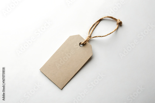 Isolated on white background, a minimalist brown paper tag with string, ideal for adding a rustic touch to gifts or product labeling needs