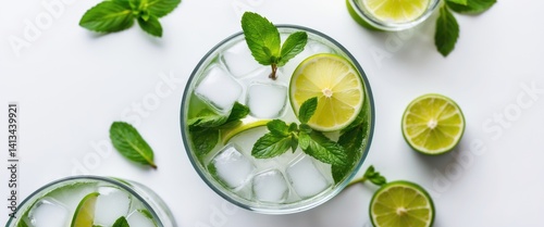 Isolated on white background, top perspective of Caipirinha and Mojito drinks with lime, mint, straw, and vodka or soda, including clipping path.