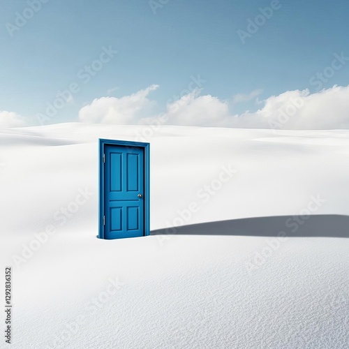 Isolated open blue door standing in a snow-covered field, surreal winter dreamscape