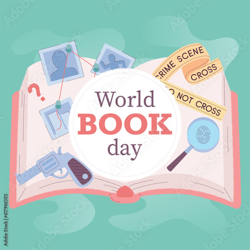 Isolated open book with detective icons World book day Vector illustration