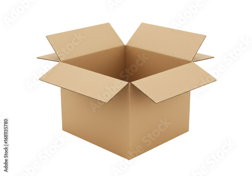Isolated open cardboard box with flaps for shipping, moving, or storage concept