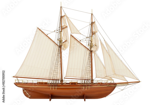Isolated sailing ship, a miniature replica of a historic vessel with delicate sails and rigging