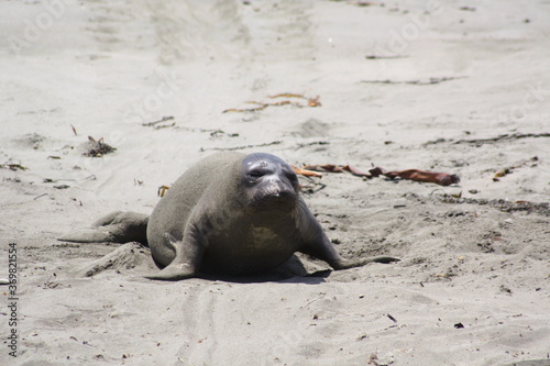 Isolated sea lion on a white sand beach near San Francisco, California, America, USA.