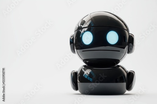 Isolated shiny black robot with glowing blue eyes on clean white background futuristic minimalistic style studio
