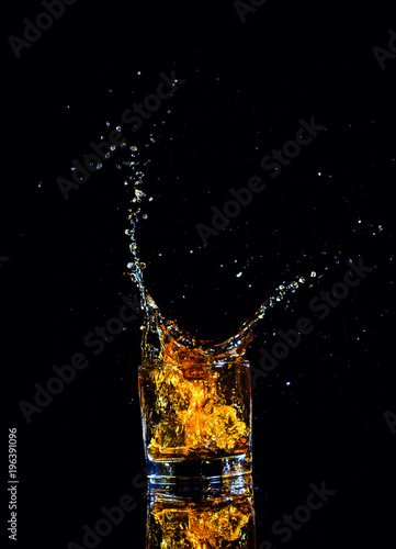 Isolated shot of whiskey with splash on black background, brandy in a glass