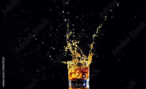 Isolated shot of whiskey with splash on black background, brandy in a glass