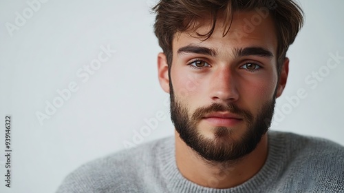 Isolated shot of young handsome male with beard mustache and trendy hairdo wears casual grey sweater has serious expression as listens to interlocutor poses in studio against white bac : Generative AI
