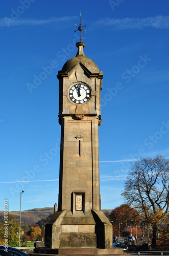 Isolated Stone Clock Tower & Tree with Golden Autumn Leaves against Blue Sky