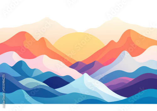 isolated transparent Background. Majestic mountain range with colorful layers and rising sun, creating serene landscape