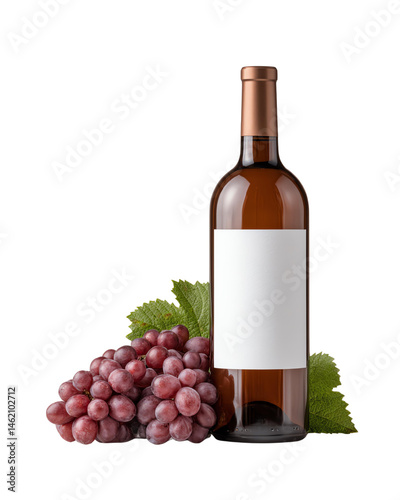 Isolated transparent Wine bottle red grape blend for elegant tasting A bottle of rosé wine next to a cluster of red grapes and green foliage.