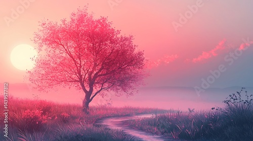 Isolated tree standing in a field bathed in soft pastel glow and dreamy light against clean backdrop