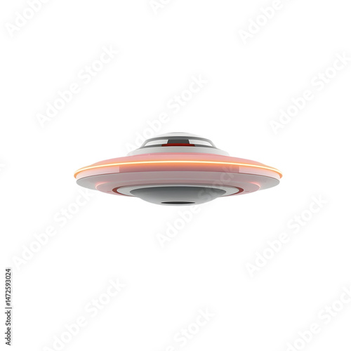 Isolated Ufo Object Image, Disk Shaped Craft With Neon Lights, Modern Technology Concept. Alien Spaceship Illustration For Design, Sci-fi Future, Plain White Background.