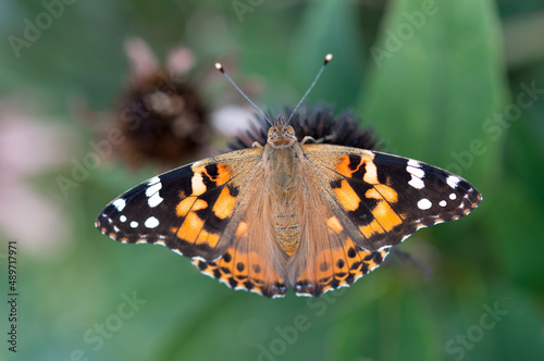 isolated Vanessa cardui or commonly "painted lady" on a green garden background (bokeh effect)