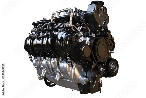 Isolated V-Type Car Engine Block with Black and Silver Elements