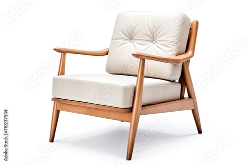 Isolated white lounge chair Modern armchair with solid wood frame Beige armchair with wooden armrests Side view of wooden lounge chair