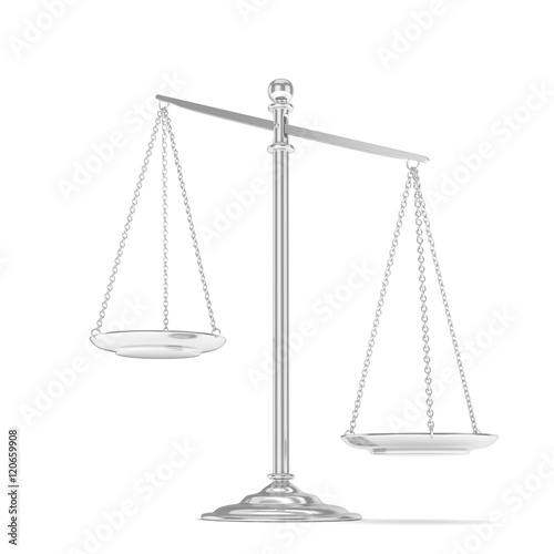 Isolated white silver scales on white background. Symbol of judgement. Law, measurement, liberty in one concept. 3D rendering.