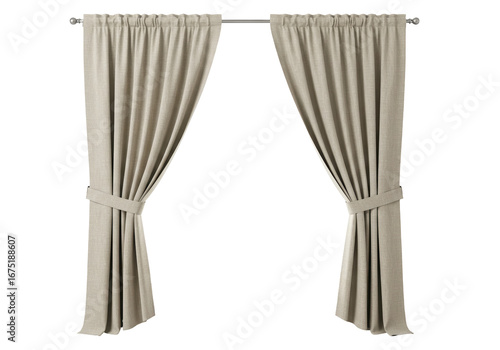 Isolated window curtains of textured tan fabric with matching tiebacks hang from a rod