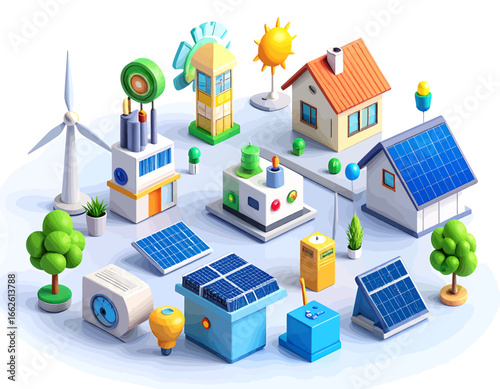 Isometric 3D Rendering of a Sustainable Future City with Renewable Energy Technologies and Smart Eco-Friendly Solutions