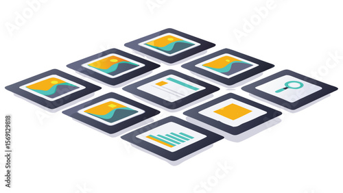 Isometric arrangement of square frames displaying various images and graphical representations in a grid layout