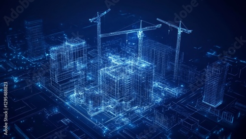 Isometric blueprint of a digital construction site with cranes and buildings on dark blue