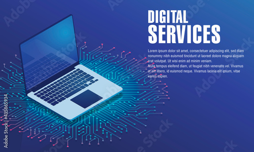 Isometric concept with with laptop and circuits. Laptop device hovering over circuits on blue background. Illustrator file with separate layers for each elements & background.