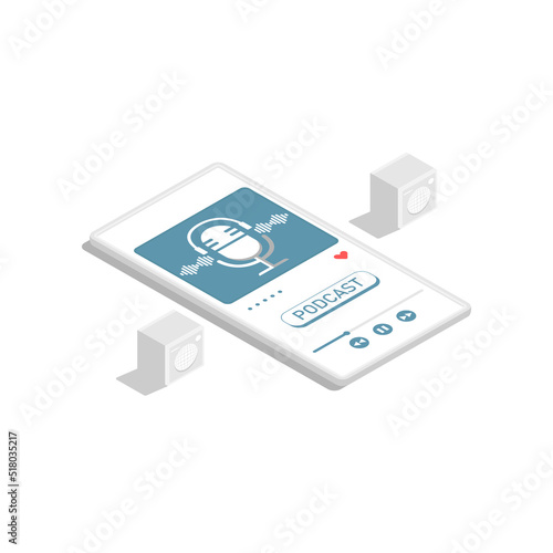 Isometric design, Podcast application on smartphone with speaker elements, Digital marketing illustration.
