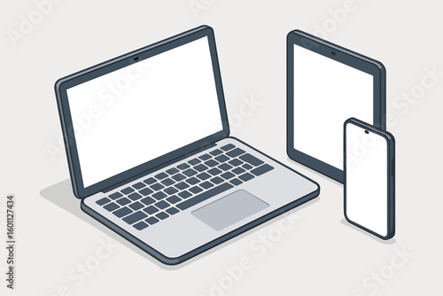 Isometric device mockup set with laptop, tablet, and mobile phone. Vector illustration of computer, smartphone, and digital pad with blank screens for presentation or web design.