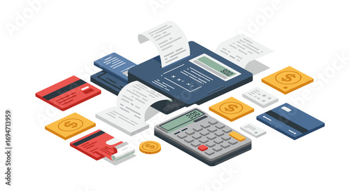 Isometric financial tools: calculator, receipts, and credit cards for budgeting