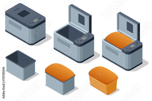 Isometric Fresh hot baked bread. Tasty loaf and bread machine on the table. Homemade baked goods