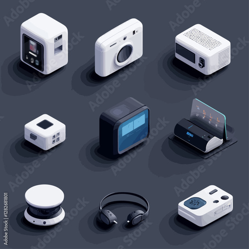 Isometric futuristic tech gadgets in minimalist white and blue design.