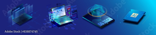 Isometric Illustration of 5G Technology with Laptop and Microchip, Isometric design of laptop, Isometric hologram 5g connection, microchip processor,